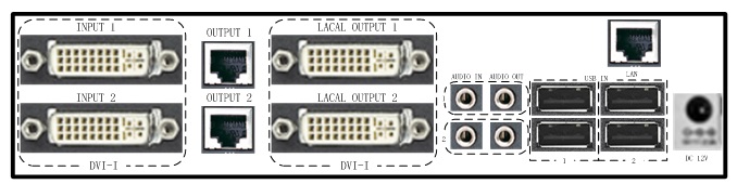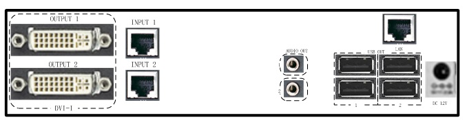 Tx接口:2个DVI-I输入,2个DVI-I本地环出,2个千兆网口,4个USB口,2个音频输入,2个音频本地环出,1个控制口;