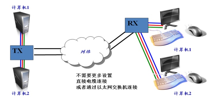 1台Tx可将本地2台单屏幕计算机的KVMA信号通过网络传输到远端,远端通过1台Rx分别接2套显示器、键盘、鼠标,在远端实现对本地计算机的控制。