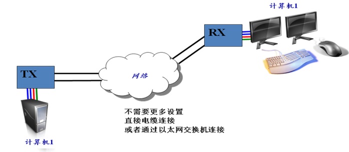 1台Tx可将本地1台双屏幕计算机的KVMA信号通过网络传输到远端,远端通过1台Rx接1套显示器、键盘、鼠标,在远端实现对本地计算机的控制。