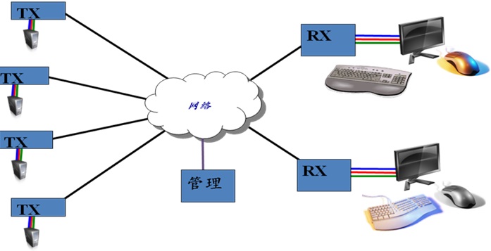 系统通过M个Tx接入计算机终端,通过N个Rx输出视频、音频和键鼠;任意Rx可根据需要切换到任意Tx,实现音视频键鼠(KVMA)的矩阵功能。